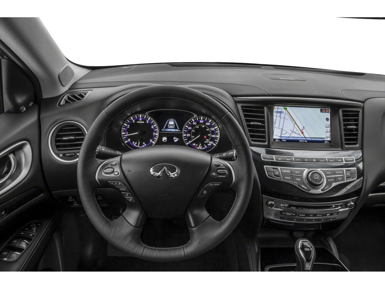 - Radio: AM/FM/CD/MP3 w/Bose Premium Audio System -inc: 13 speakers, navigation, 2 A/V USB ports, Radio Data System (RDS), speed-sensitive volume controls, auxiliary A/V input jacks, 12-volt power outlet in front center console and INFINITI InTouch w/8" color touch-screen display, voice recognition, Bluetooth® hands-free phone system, Bluetooth® audio streaming, SiriusXM Satellite Radio and SiriusXM Travel Link
